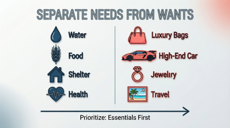 This step helps you make better decisions. Needs are essentials such as food, rent, utilities, and basic transport. Wants are things that improve comfort but are not necessary, like dining out or entertainment.